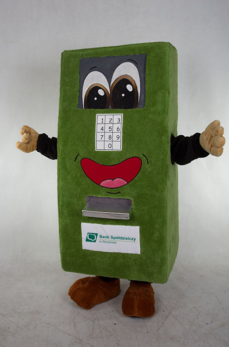 Wiele wykonanych przez naszą pracownie maskotek pluszowych,pluszowych strojów reklamowych jest w formie bankomatów.Dziś prezentujemy kostium promocyjny wykonany dla banku w Strzyżewie.